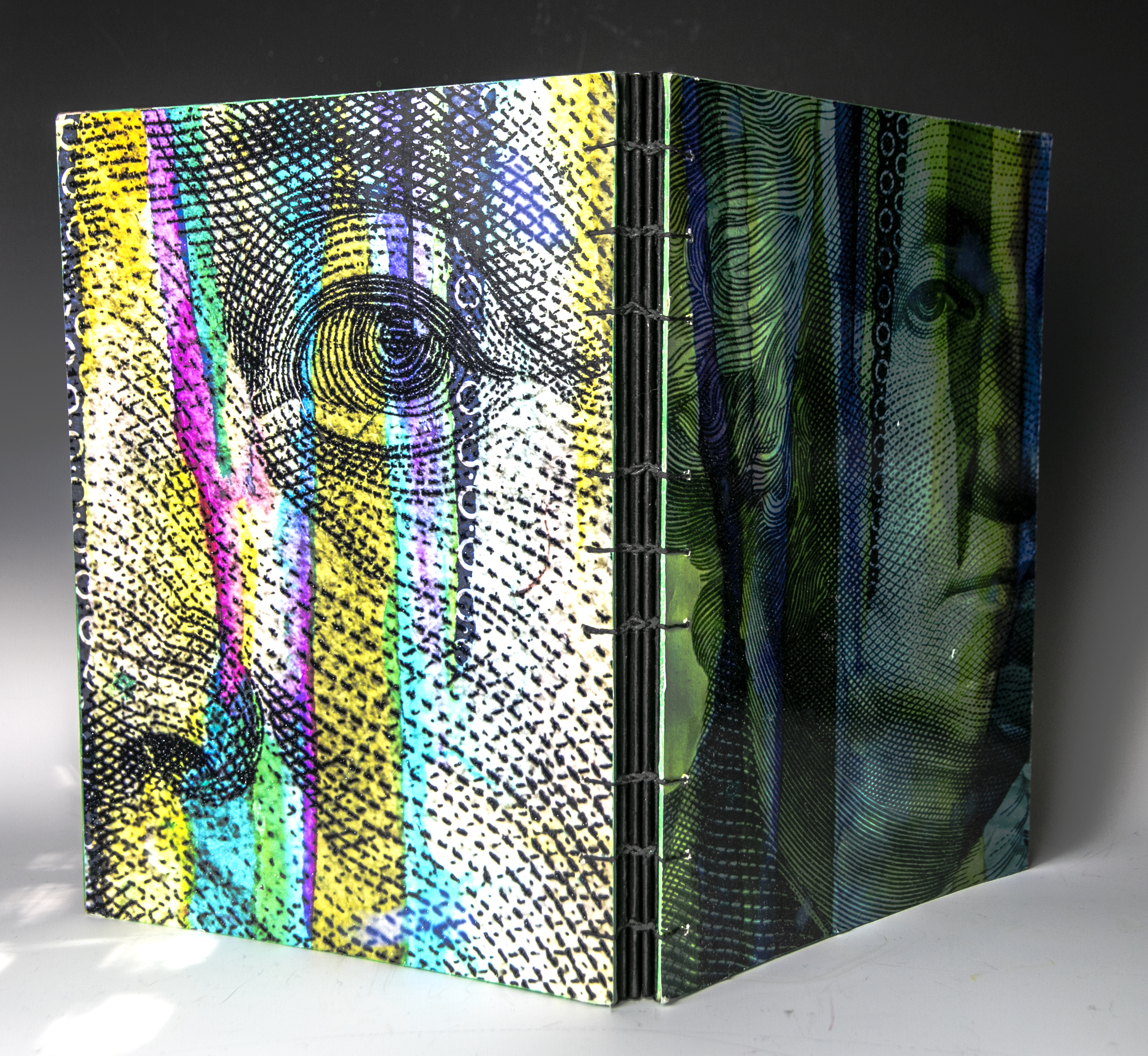 Just to be sure I could remember the Coptic stitch, I made another book. This one is 8" x 12", and the cover was created with photos I took while in New York City. The red edges are paint with a paint pen.